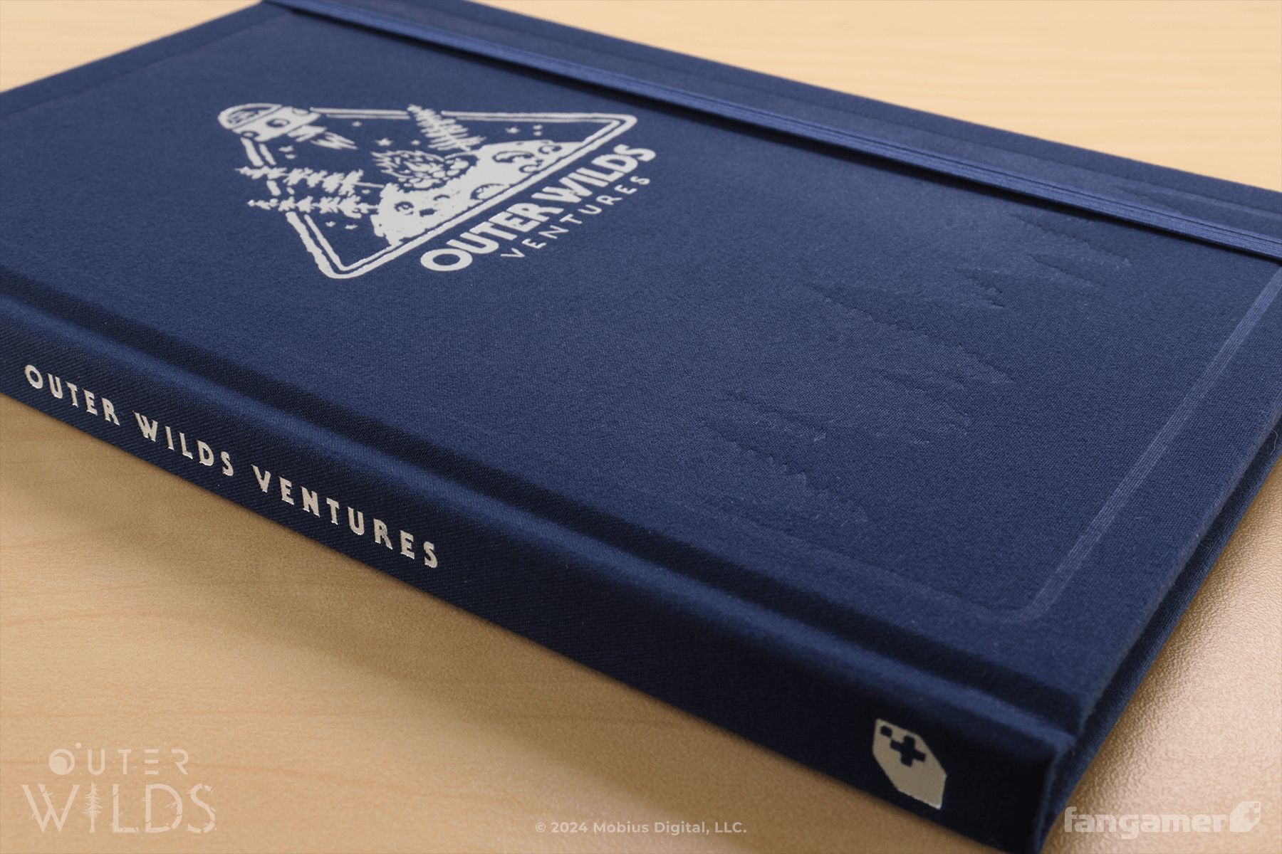 This official Outer Wilds notebook measures about 14 by 21.5 centimeters and contains 128 pages. It was designed by Tony Kuchar, with illustrations by Saber Murphy.