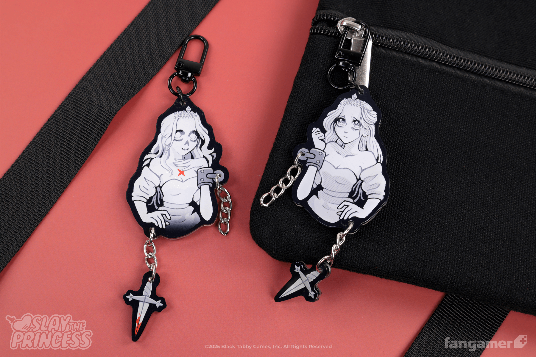 This official Slay the Princess acrylic keychain was designed by Melora Mylin. It's about 96 mm long.