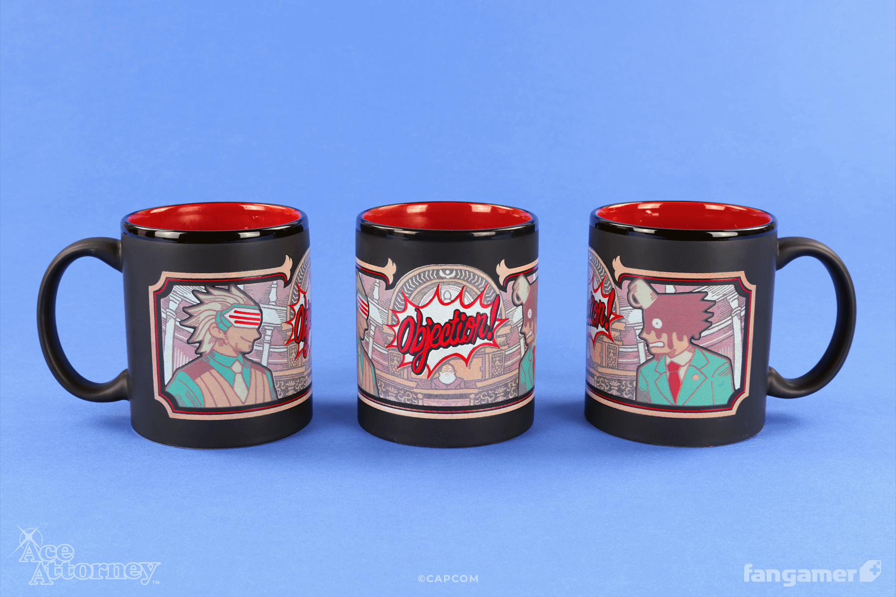 This official Ace Attorney 325 mL coffee mug was designed by Ade. Godot and Phoenix Wright appear when you fill it with coffee (or any other hot drink).