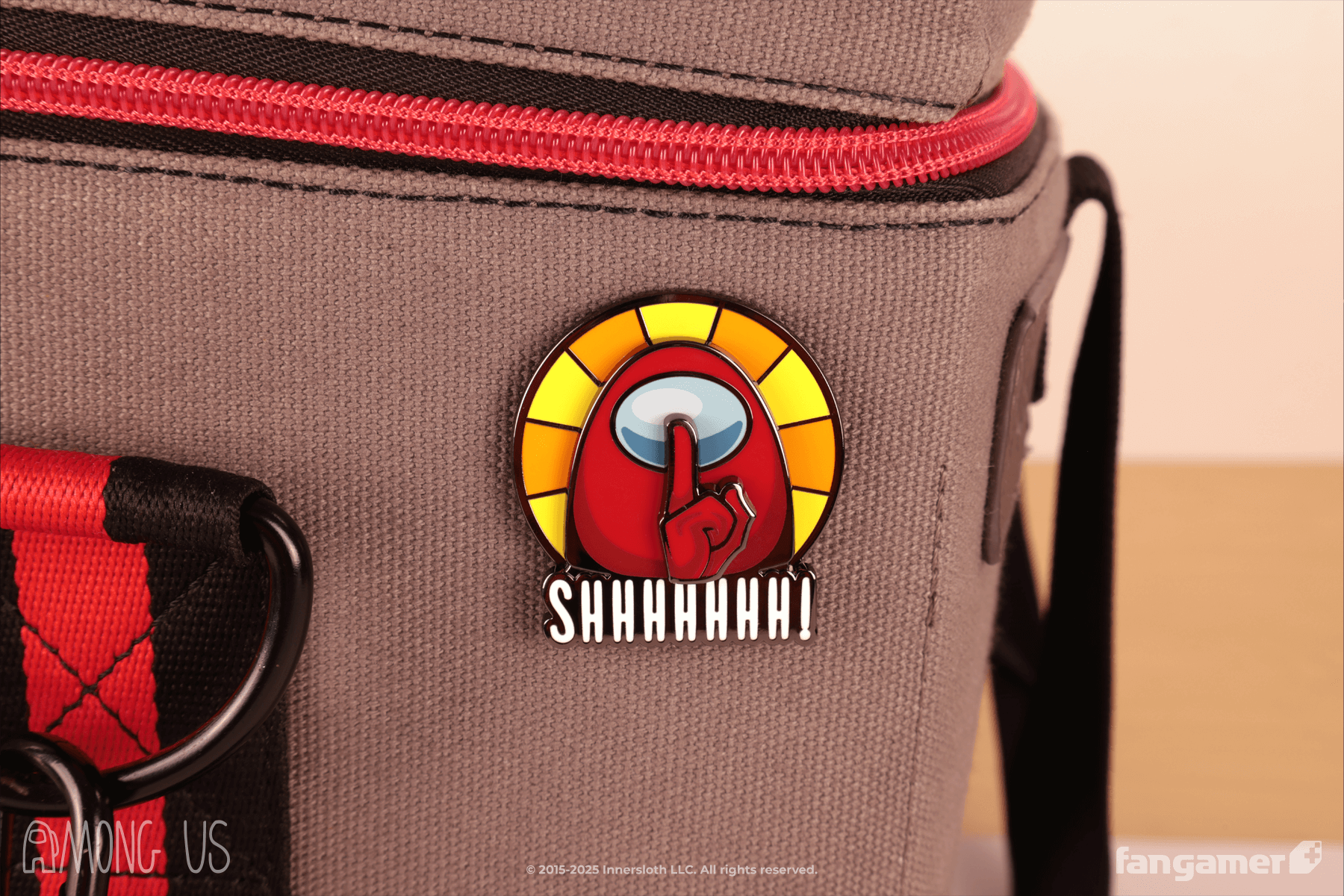 This official Among Us hard-enamel spinning pin was designed by Jon Kay. It's about 42 mm tall.