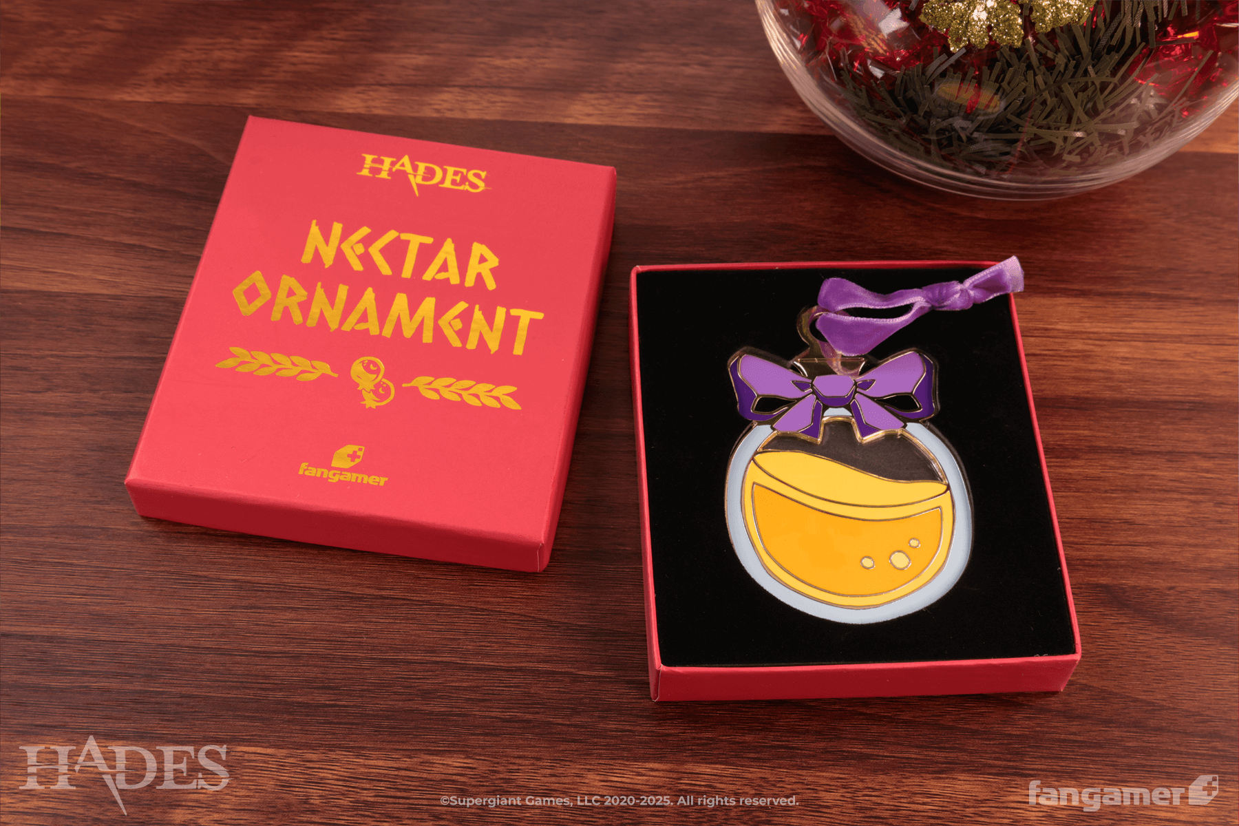 This official Hades ornament was designed by Nina Matsumoto. It's a metal ornament with a soft-enamel finish and a transparent paste fill, measuring about 91 mm tall. It hangs from a purple velvet ribbon.