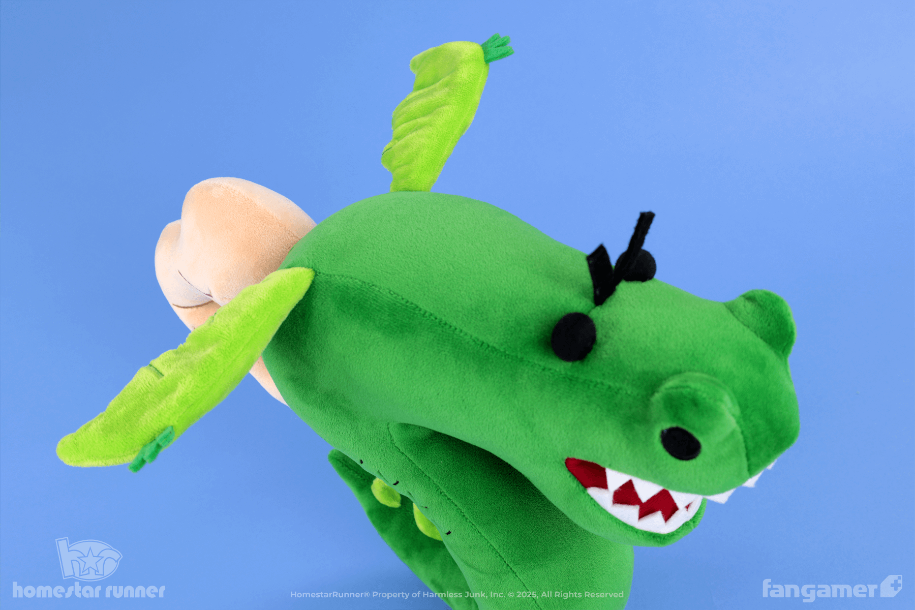 This official Trogdor plush was designed by Eyes5. It's about 40 cm tall, from wing to foot.