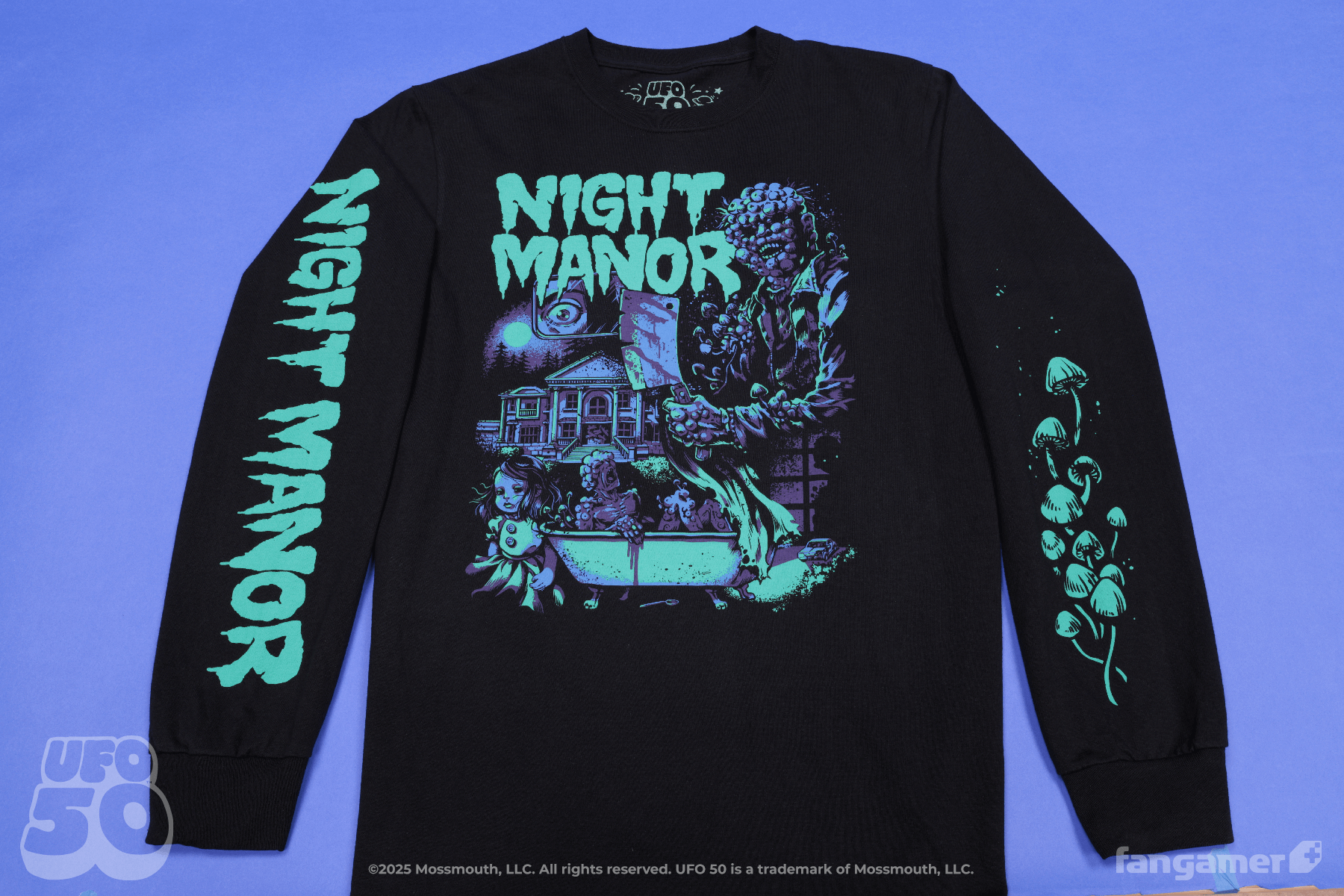 This official UFO 50 long-sleeve shirt was designed by Nina Matsumoto and printed by Forward in three locations on 100% cotton garments from Port & Company.